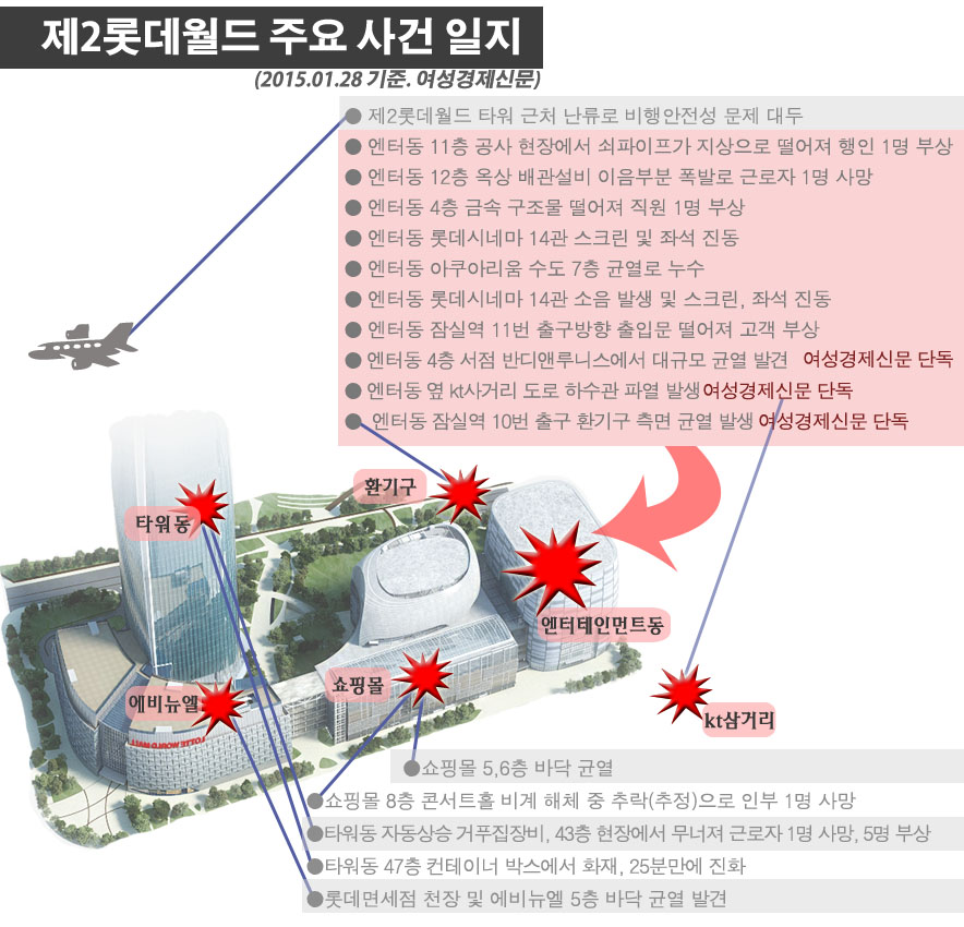 여성경제신문이 ‘제2롯데월드 13건 중 8건이 엔터동에서(1월 15일 자)’를 통해 밝혔듯이 엔터테인먼트동을 중심으로 크고 작은 사건 사고가 광범위하게 이어진다는 것이 증명됐다. 지난 1월 15일에는 KT삼거리에서 원인불명의 하수관 파열이 일어나 일대를 물바다로 만들기도 했다.