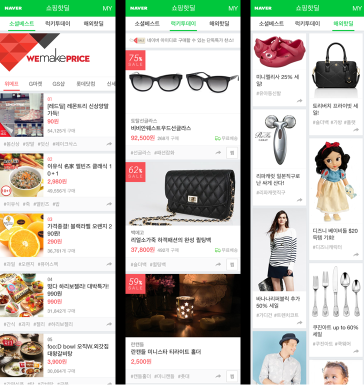 새롭게 선보이는 쇼핑핫딜은 ▲소셜커머스, 오픈마켓, 종합몰, 대형마트 등의 핫딜 상품들을 업체 별로 모아 보여주는 '소셜베스트' ▲네이버 스토어팜과 같은 소규모 온라인 쇼핑몰들의 할인 상품을 보여주는 '럭키투데이' ▲해외 핫딜 정보를 찾아서 보여주는 '해외핫딜' 등 총 3가지 카테고리로 구성되어 있다.