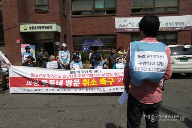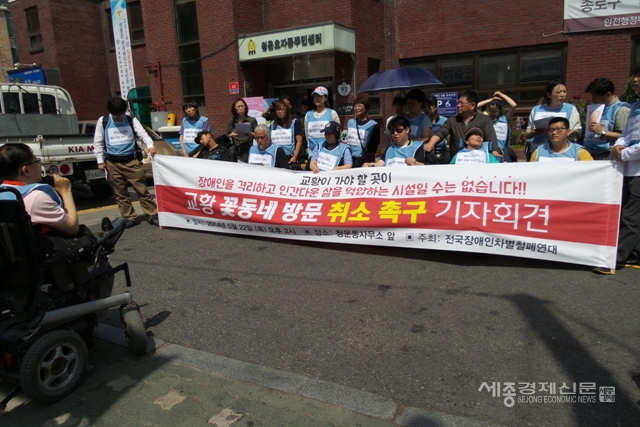 ▲ 22일 청와대 인근 청운동사무소앞에서 전국장애인차별철폐연대가 기자회견을 하고있다(사진=세종경제신문 제공)22일 오후 전국장애인차별철폐연대가 청와대 인근 청운동사무소 앞에서, 오는 8월 14일부터 18일 까지 방한 예정인 프란치스코 교황의 8월16일 꽃동네 방문을 취소하라고 촉구하는 기자회견을 갖고 있다. ▲ 22일 청운동사무소앞에서 전국장애인차별철폐연대가 기자회견을 하고있다(사진=세종경제신문 제공)