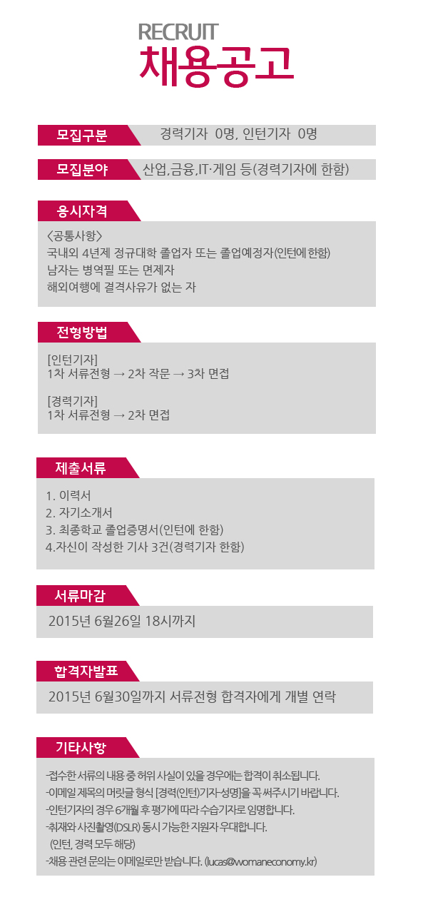 서울문화사가 야심차게 준비한 젊은 언론 '여성경제신문'이 창간 1주년을 맞아 꿈과 패기를 갖춘 경력기자와 인턴기자를 모집합니다.