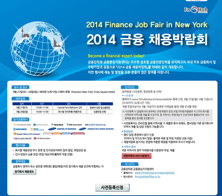 금융감독원 금융중심지지원센터는 국내 금융산업의 미래성장을 견인할 해외 우수 인재의 발굴 및 유치를 위하여 9월27일∼28 이틀간 미국 뉴욕에서 뉴욕 금융 채용박람회(2014 Finance Job Fair in New York)를 개최할 계획이다.