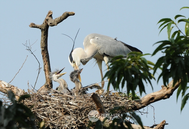 2월 하순에서 3월초에 걸쳐 남쪽나라에서 겨울을 지내고 우리나라에 오는 왜가리는 짝을 지어 둥지를 짓고, 알을 낳아 부화시키고, 먹이를 먹여 키우는 똑같은 일을 올해도 되풀이 하였다. 5월 초순, 알에서 깨어난지 얼마 안되는 왜가리 새끼가 어미와 입맞춤을 하고 있다. 먹이를 달라고 보채는 것 아닐까? 새끼를 내려다 보는 어미의 눈빛이 따스하기만 하다. 어느정도 자란 새끼들은 8월에 어미를 따라 남쪽나라로 떠났을 것이다. 내년 이른 봄 몰라보게 자란 모습으로 다시 이 나라를 찾아 같은 곳에 다시 둥지를 틀겠지.