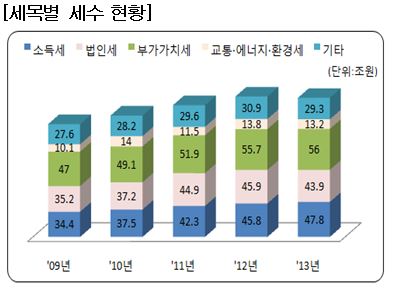 첫째 2013년 국세청 세입은 190.2조원으로 2012년에 비해 1.9조원 감소했다.