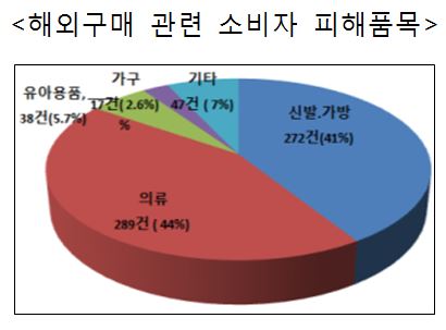 피해 품목은 의류가 289건(44%), 신발·가방 등 잡화가 272건(41.0%) 등 의류·잡화가 대부분(85%)을 차지했고 그 뒤를 유아용품(38건, 5.7%)이 이었다.