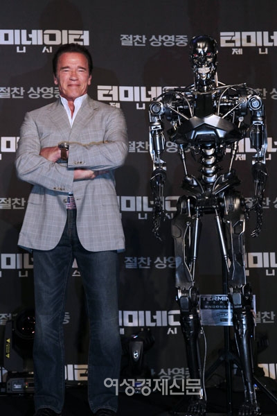 ▲ 2일 오전 서울 강남구 리츠칼튼 호텔에서 영화 '터미네이터 제니시스' 내한 기자회견이 열렸다. 터미네이터 역을 맡은 아놀드 슈왈제네거가 터미네이터 모형과 나란히 포즈를 취하고 있다. /유은영 기자 ey20150101@gmail.com
