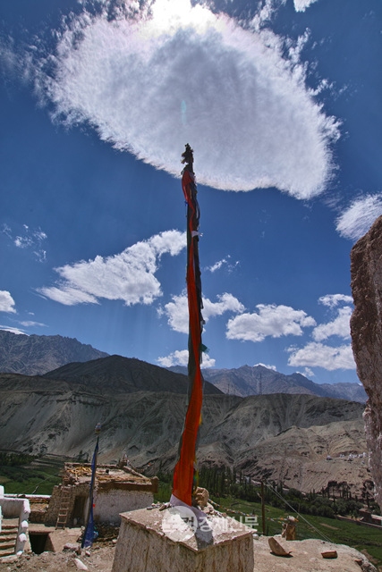 ▲ 타르쵸와 구름인도 북부 라다크의 한 곰파(라마불교사원)에 세워져있는 장대모양의 타르쵸. (타르쵸는 라마불교 경전이 인쇄된 기도 깃발) 타르쵸 끝에 구름이 솜사탕처럼 걸려있다. (2014.8.6. 촬영)