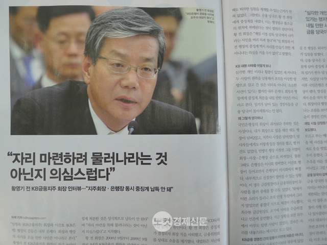 황영기 전 KB회장은 최근의 KB사태와 관련, "금융당국이 지주사 회장과 은행장을 동시에 중징계 처분한 것은 상식적으로 납득이 안된다"며 "자리 마련을 위해 물러나라는 것이 아닌지 의심스럽다"고 시사주간지 <시사저널> 최신호 인터뷰에서 밝혔다.