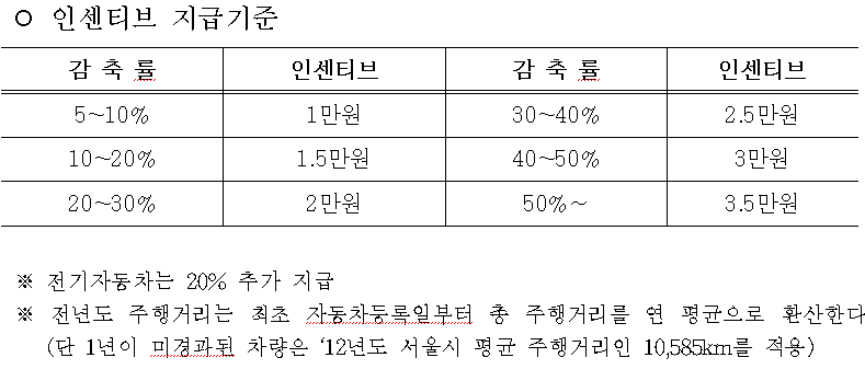 기존보다 자동차를 덜타 주행거리를 감축하면 감축률에 따라 6개월간 최대 3만5천원까지 인센티브를 준다.
