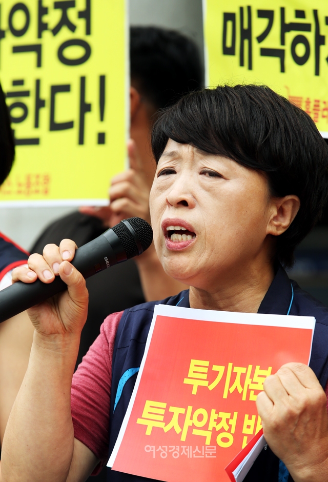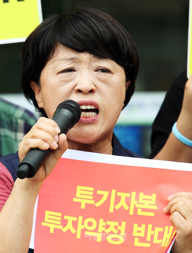 ▲ 이경옥 민주노총 서비스연맹 사무처장이 28일 오전 서울 강남구 국민연금공단 서울남부지역본부 앞에서 열린 ‘홈플러스 노동조합, 국민연금 MBK 투자약정 철회 촉구’ 기자회견에 참석해 발언을 하고 있다. /photoyms@seoulmedia. co. kr▲ 이경옥 민주노총 서비스연맹 사무처장이 28일 오전 서울 강남구 국민연금공단 서울남부지역본부 앞에서 열린 ‘홈플러스 노동조합, 국민연금 MBK 투자약정 철회 촉구’ 기자회견에 참석해 발언을 하고 있다. /photoyms@seoulmedia. co. kr