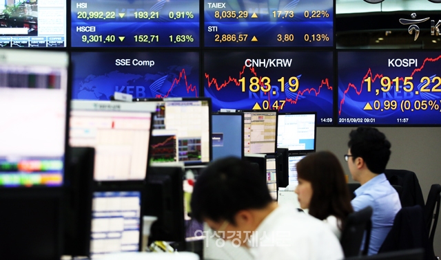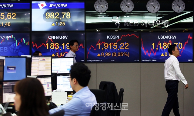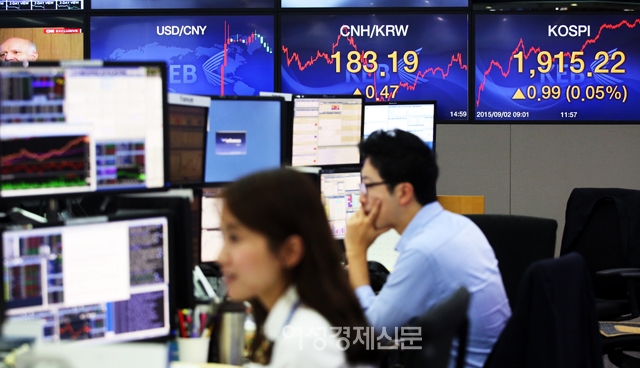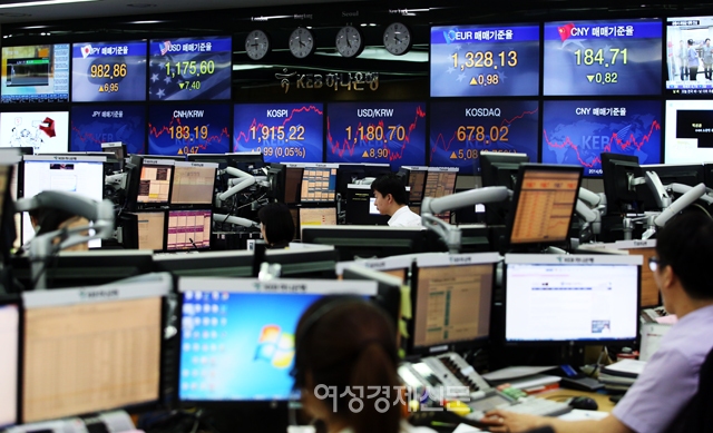 ▲ 코스피 지수가 전 거래일보다 0.99포인트 오른 1, 915.22로 장을 마감한 2일 오후 서울 중구 KEB하나은행 본점 딜링룸에서 딜러들이 업무를 보고 있다. 코스닥 지수는 전 거래일보다 5.08포인트 오른 678.02으로 장을 마쳤다. /photoyms@seoulmedia. co. kr