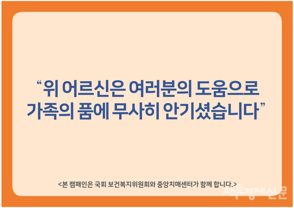 <팩트경제신문>이 실종 어르신 찾기 캠페인을 시작합니다. 국회 보건복지위원회(위원장 김민석) 및 중앙치매센터와 함께 잃어버린 가족을 찾는 데 작은 힘을 보태고자 매일 오전 실종 어르신에 대한 정보를 기사화합니다. 독자 여러분의 많은 관심을 부탁드립니다.