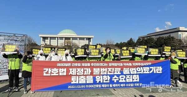 12일 서울 여의도 국회의사당 앞. 영하 5~6도의 추운 날씨에도 매서운 칼바람을 뚫은 수십명의 구호가 울려퍼졌다. 대한간호협회(이하 간협)와 전국 간호대학생 등이 참여하는 '간호법 제정과 불법진료·불법의료기관 퇴출을 위한 수요 집회' 현장이다.
