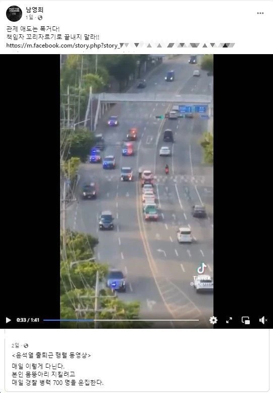 남 부원장은 2일 네티즌 A씨가 전날 올린 동영상을 자신의 페이스북에 공유했다. A씨는 경호 차량들이 줄지어 도로를 달리는 영상과 함께 “윤석열 출퇴근 행렬 동영상. 매일 이렇게 다닌다. 본인 몸뚱아리 지키려고 매일 경찰 병력 700명을 운집한다”고 썼다.