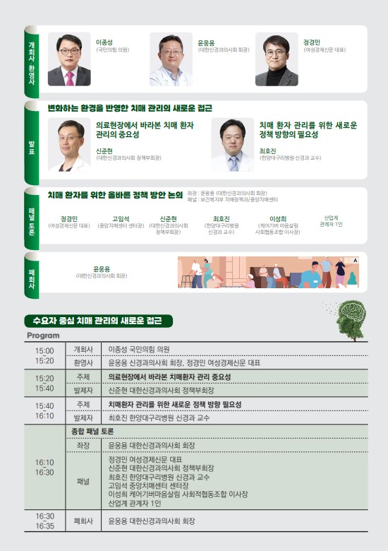 패널 토론에선 '치매 환자를 위한 올바른 정책 방안 논의'를 주제로 고임석 중앙치매센터 센터장, 신준현 대한신경과의사회 정책이사, 최호진 한양대구리병원 신경과 교수, 이성희 케어기버 사회협동조합 이사장, 정경민 여성경제신문 대표, 산업계 관계자 등이 함께 토론을 진행한다. 윤웅용 대한신경과의사회 회장이 토론회 좌장을 맡는다.