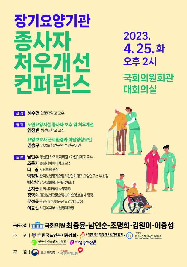 21일 한국노인복지중앙회 등에 따르면 본지와 장기요양 4개 단체는 오는 25일 서울시 여의도 국회의사당 국회의원회관 대회의실에서 '장기요양기관 종사자 처우개선 컨퍼런스'를 진행한다. 해당 컨퍼런스는 국내 노인 요양 시설 등에 종사하는 요양보호사의 처우 개선을 위한 논의의 장으로 마련된다.