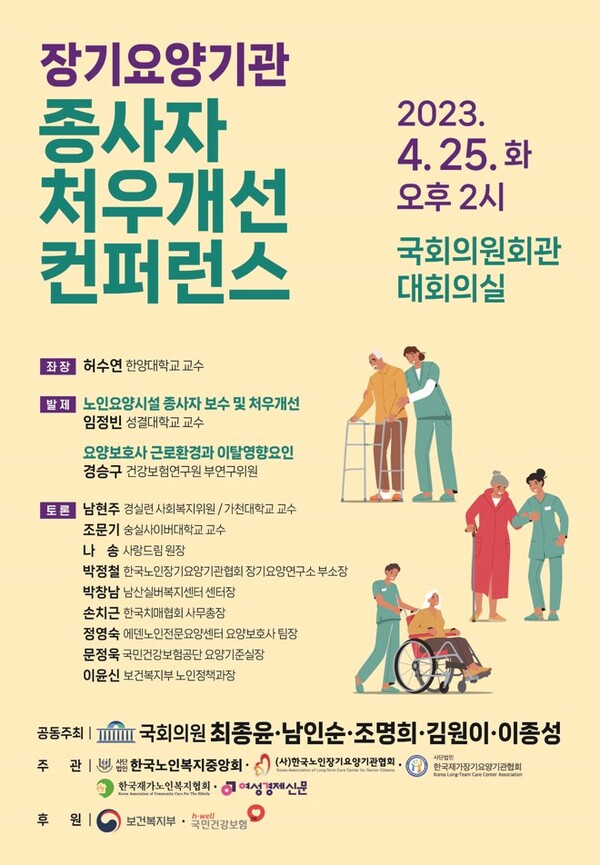 24일 한국노인복지중앙회 등 국내 요양기관 4개 단체에 따르면 25일 오후 2시 서울 여의도 국회의사당 의원회관 대회의실에서 '장기요양종사자 처우개선 컨퍼런스'가 진행된다. 컨퍼런스는 여성경제신문과 장기요양 4개 단체가 함께 주관하고 최종윤 더불어민주당 의원실을 포함한 5개 보건복지위원회 의원실이 주최한다.