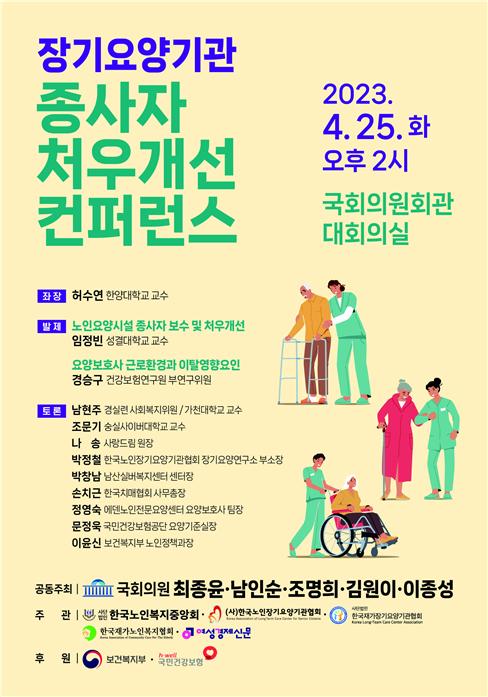 오는 25일 국회 보건복지위원회 소속인 최종윤 더불어민주당 의원은 국회의원회관 대회의실에서 '장기요양기관 종사자 처우개선 컨퍼런스'를 개최한다. 토론회는 위원회 소속인 남인순 더불어민주당 의원·조명희 국민의힘 의원·김원이 더불어민주당 의원·이종성 국민의힘 의원과 공동으로 주최한다.