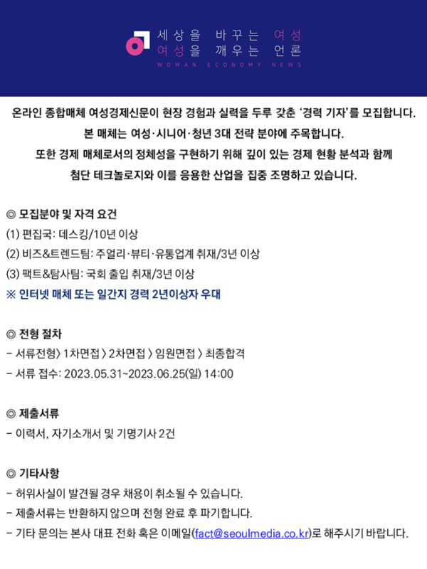 여성경제신문에서 자신의 역량을 발휘하고 싶은 분들은 경력 기자직에 응모해 주십시오. 접수 기간은 5월 31일~6월 25일(14:00)까지이며, 잡코리아·사람인 본사 메일을 통해 지원할 수 있습니다.