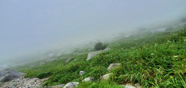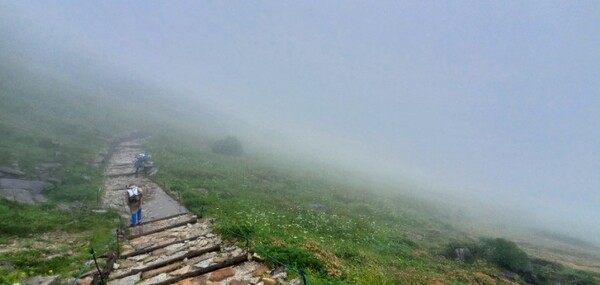 궂은 날씨에도 개별적으로 온 등산객이 있었다. 산을 오르는 사람들은 상관이 없나 보다. 신나 보이기까지 한다. 도쿄 방면에서 온 우리 일행도 쉬이 올 수 있는 곳이 아니니 망설임 없이 나선다. 나 홀로 참가여서 안개 자욱한 곳에서 길을 잃으면 곤란하다. 앞서가는 사람들 뒤를 따랐다. 아름다운 경치를 보는 건 포기했다. 하지만 어쩌면 몽환적인 풍경이 기다리고 있을지도 모른다.