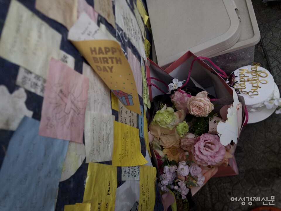 생일은 매년 돌아오지만, 생일케이크를 받을 사람은 돌아오지 않는다. 위태롭게 걸린 생일 카드와 주인 잃은 생일케이크에 추모객들의 눈길이 머문다.