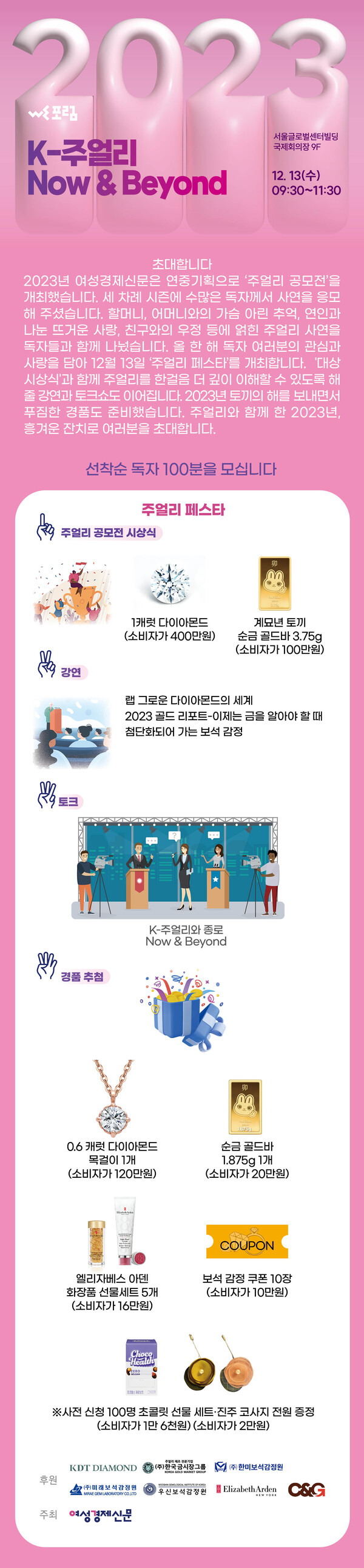 ※여성경제신문이 올 한 해 연재해 온 '주얼리 공모전'의 대미를 장식할 '주얼리 페스타가 열립니다. 선착순 독자 100분을 모십니다. 아래 포스터를 클릭하시면 사전 등록 페이지로 연결됩니다. 사전 등록하신 선착순 100분에게만 경품 추첨의 기회를 드리니 서둘러 신청해 주세요.