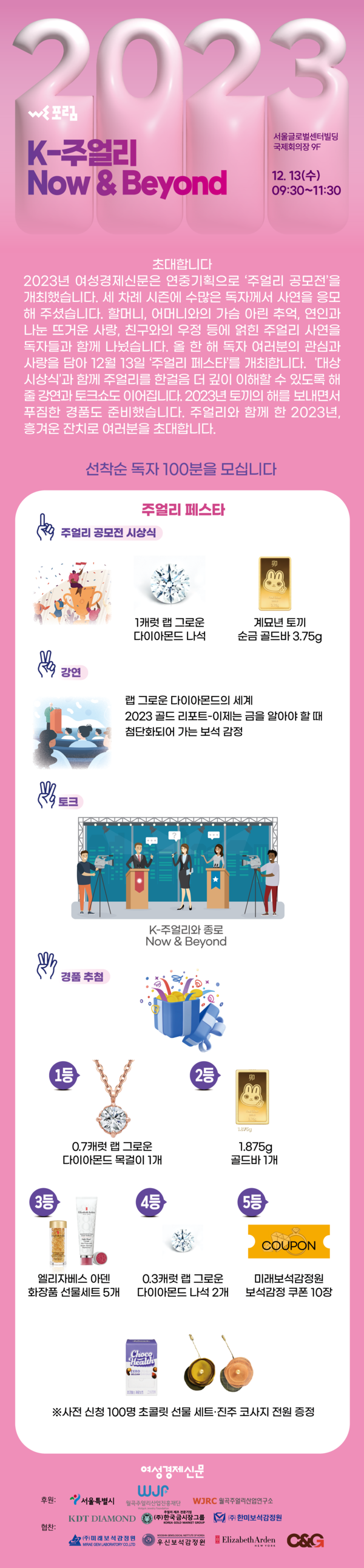 올 한 해를 마무리하는 12월 국내 주얼리 산업의 메카 종로에서 '주얼리 페스타'가 열린다. 여성경제신문이 연중 기획으로 연재해 온 주얼리 공모전 대상작 시상식과 함께 주얼리 관련 강연과 토크쇼에 이어 다이아몬드 목걸이, 순금 골드바, 화장품 선물 세트 등 푸짐한 경품 추첨까지 다양한 이벤트가 이어진다. 행사는 12월 13일 서울 종로구 서울글로벌센터 9층 국제회의장에서 오전 9시 30분부터 12시까지 진행된다.