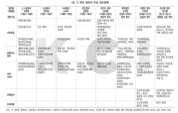 박정희 정부는 △산재보험 △건강보험 △공무원연금 △군인연금 △사학연금 △생활보호제도 등 10가지 정책을 발의했다. 전두환 정부에선 △건보 확대 △영세민 종합대책 △사회복지 전문요원 신설 △노인복지 기반 마련 △재가노인 복지사업 등 5개를 제안했다. 노태우 정부 또한 △전국민 건강보험 △국민연금 △저소득층 영구임대주택 △장애인복지대책위원회 △장애인등록제 등 5가지 정책을 냈다.