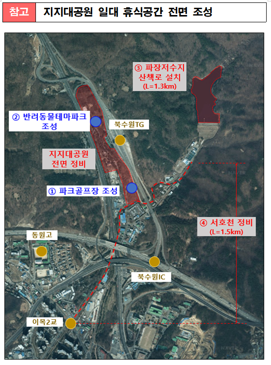 이에 지지대공원 북측에 위치한 유휴부지를 활용하여 오프리쉬존 및 반려동물 수영장, 카페 등 놀이시설을 갖춘 반려동물 테마파크를 조성할 계획으로, 약 50억원의 예산이 소요될 전망이다.