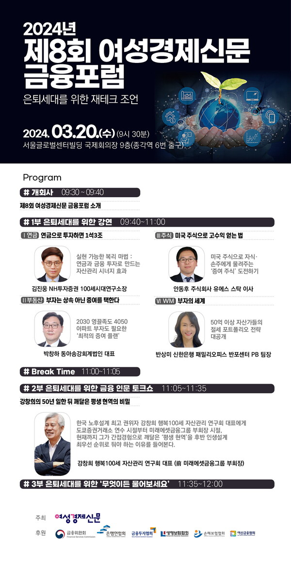 이번 포럼은 총 3부로 진행된다. 1부에서는 연금·부동산·주식·웰스매니지먼트 각 분야의 전문가가 풍족한 은퇴 이후를 위해 꼭 알아두어야 할 '금융 꿀팁'을 알려준다. 2부는 행복100세자산관리연구회의 강창희 대표가 50년 일한 뒤 깨달은 인생 설계 비법을 전수한다. 3부는 질의응답 시간이다.