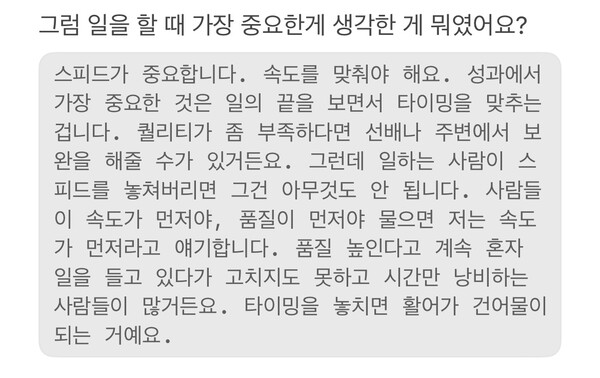 스피드를 중시했어요. 제안서를 쓰고 있는 제게 너무나 필요한 조언이었어요. 저는 당장 내일이 마감인 제안서와 예산안을 붙들고 상사에게 해볼 수 있는 데까지 정리해 보겠다고 했죠.