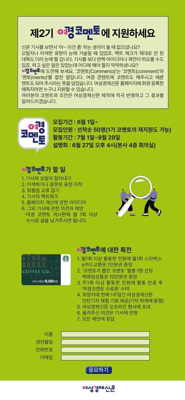 한편 1기 여경 코멘토의 활동은 6월 30일로 종료된다. 이에 본지는 7월 1일부터 9월 29일까지 활동할 2기 여경 코멘토를 6월 1일부터 선착순 공모한다. 1기 여경 코멘토도 재응모할 수 있다. 코멘토 특전으로는 1기의 특전에 더하여 주1회 이상 활동한 코멘토에게 ‘여경 코멘토 수료증’이 수여되고 희망자에 한해 1주일간 본지 인턴기자 체험 기회가 제공된다.