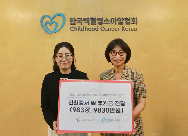 대상그룹은 이날 2024 전국민 동참 헌혈 캠페인 ‘레드챌린지’ 헌혈증서 및 후원금 전달식을 진행하고, 7월 한달간 ‘레드챌린지’ 캠페인을 통해 모은 헌혈증서 983장과 9830만원의 후원금을 한국백혈병소아암협회에 기부했다.