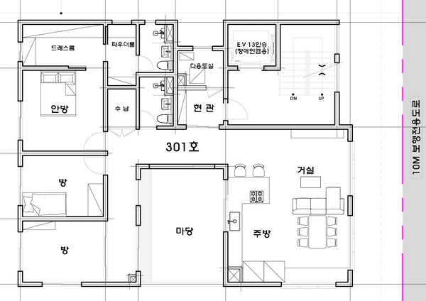 지금 설계 작업 중인 상가주택의 단독주택에도 안방 대신 부부 침실 영역을 조닝(구획화)해서 진행하고 있다. 네 개의 방이 비슷한 크기인데 추후 라이프사이클 프로그램에 따라 아이들이 독립해 나가게 되면 중문을 달아 침실 영역을 확보할 수 있도록 계획하였다. 물론 지금은 아이들이 어느 방을 쓰더라도 부부의 방과 다름없는 평등한 식구들의 주거 생활이 가능한 모두의 '우리집'이 된다.