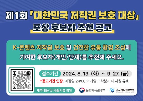 문화체육관광부와 한국저작권보호원은 K-저작권을 지키는데 공로가 큰 개인이나 기업·단체를 공모합니다. 공정한 심사를 거쳐 8명에겐 문체부 장관상, 2명에게 저작권보호원장상을 수상하는 '제1회 저작권보호대상'을 11월에 엽니다. 저작권 보호에 앞장선 개인이나 기업·단체의 많은 지원을 바랍니다. 아래 배너를 클릭하면 제1회 저작권보호 대상 공모 안내 페이지로 연결됩니다. 9월 27일까지 마감.
