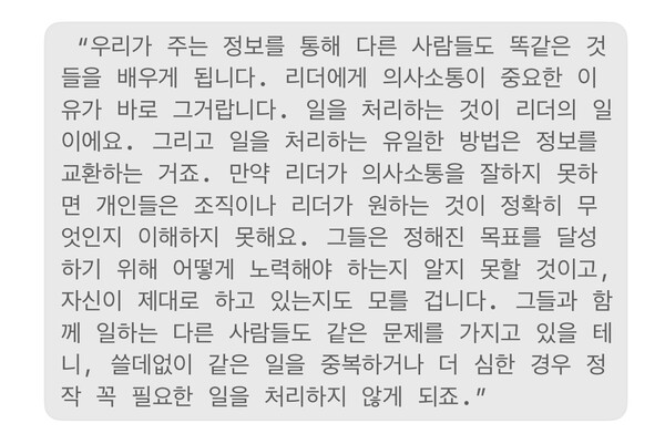 나는 리더가 아니라서 이런 책은 필요 없다고요? 각자의 인생 리더잖아요. 삶에 문제와 어려움은 언제나 존재합니다. 우리가 훌륭한 리더를 필요로 하는 이유죠. 내 인생을 잘 이끌어가기 위해서도 이 책에서 소개하는 경영 원칙을 들여다보는 것은 어떨까요? 오늘은 그 중 가장 기본이라고 할 수 있는 ‘의사소통’에 대해 살펴볼게요.