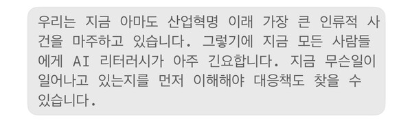 1강 ‘걷잡을 수 없는 변화의 물결’에서는 우리의 일과 삶에 급격히 파고든 인공지능을 개괄적으로 이야기합니다. 2강 ‘모두를 놀라게 만든 거대언어모델, LLM의 등장’에서는 챗 GPT로 알아보는 인공지능의 정체를 말하죠. 3강 ‘인공지능이 인간보다 똑똑해질 수 있을까?’에서는 생성형 AI의 놀라운 능력과 최근의 기술 흐름에 대해 설명합니다. 4강 ‘열려버린 판도라의 상자’에서는 AI의 확산과 필연적으로 도래할 충격들에 대해 이야기하고요. 5강 ‘신뢰할 수 있는 인공지능, 어떻게 구축할까?’에서는 세계 각국의 윤리 원칙과 법제화 노력에 대해 말합니다. 마지막 6강 ‘우리 사회는 어떻게 대응해야 하는가?’에서는 후진국이 되지 않기 위한 제언을 강조하며 마무리합니다.