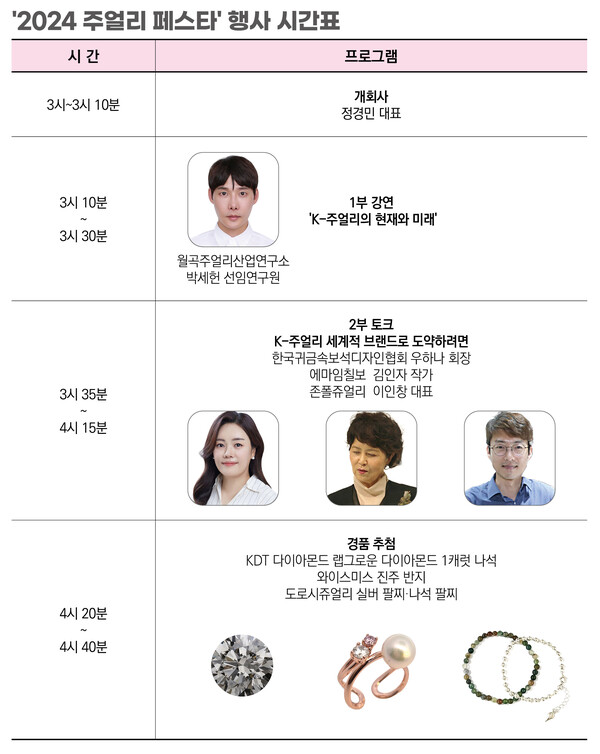 당일 참석자를 대상으로 푸짐한 경품 추첨 행사도 진행된다. KDT다이아몬드가 협찬하는 1캐럿 랩그로운 다이아몬드 나석, 와이스미스 진주반지, 도로시 주얼리 실버·천연석 팔찌 등을 참석자 중 추첨을 통해 증정한다.