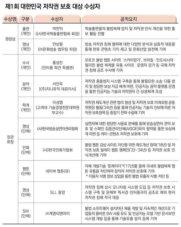 문체부 장관 표창은 개인으로 ㈜지니뮤직 서인욱 대표이사, 홍성진 인터폴 파견 특별관, 이성엽 고려대 기술경영전문대학원 부교수가 받았다. 단체로는 한국방송실연자권리협회와 한국만화가협회, 네이버웹툰, SLL중앙, ㈜계영 티앤아이 등이 수상했다.