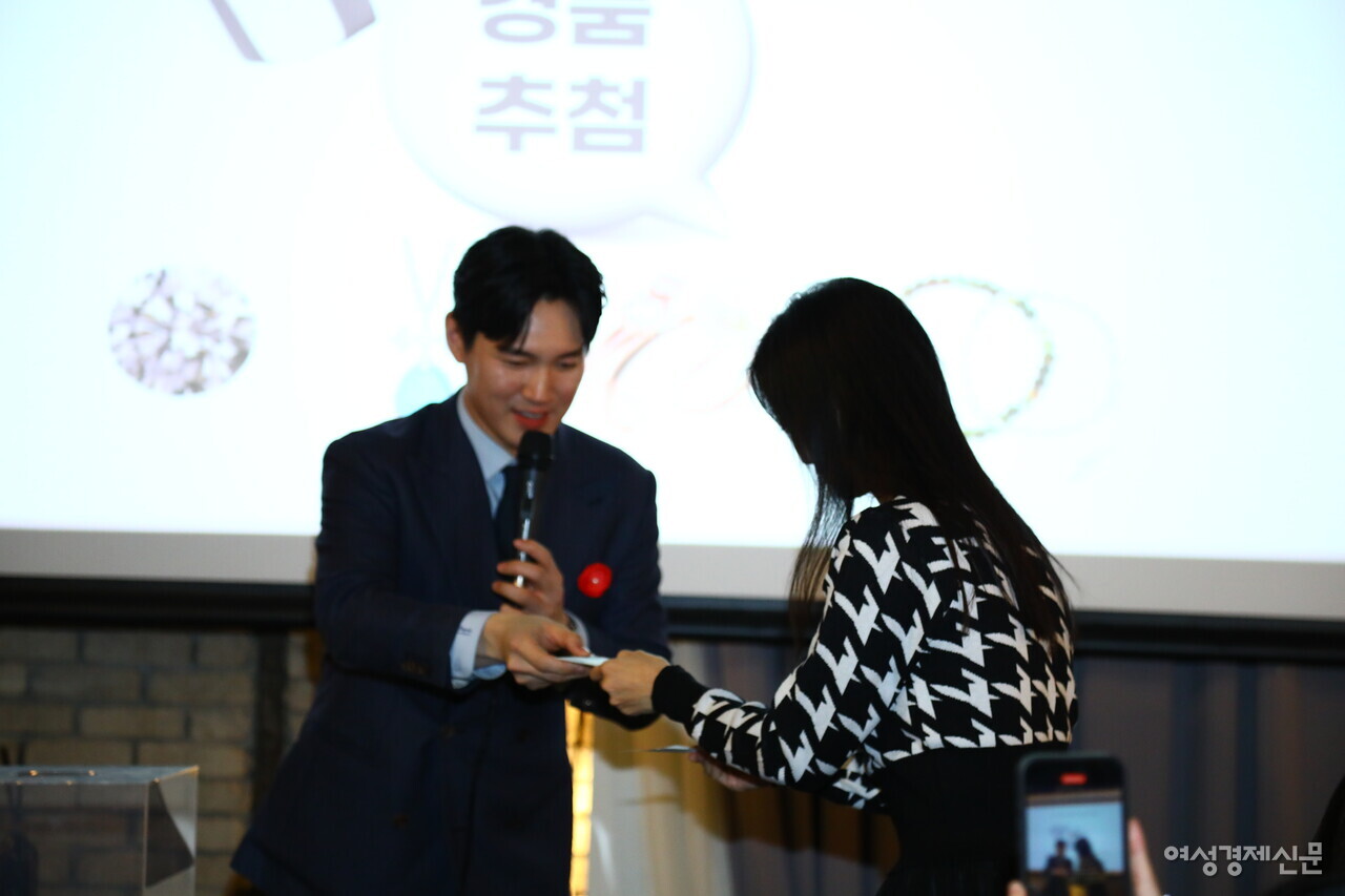 정경민 여성경제신문 대표이사가 2024 주얼리 페스타에 참석한 관객을 대상으로 진행한 경품 추첨 행사에서 1등을 뽑고 있다. /류빈 기자