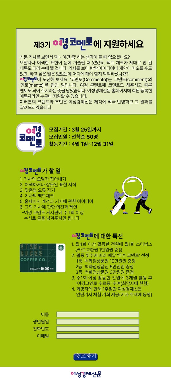 여성경제신문의 독자 옴부즈맨이자 매체와 독자 간 소통을 담당하게 될 ‘여경 코멘토’ 제3기를 3월 25일까지 선착순 50명 모집한다. 자격 제한은 없으며 여성경제신문 독자라면 누구나 응모할 수 있다. 기존 여경 코멘토도 재응모할 수 있다.