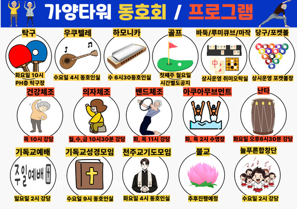 우쿠렐레, 당구, 아쿠아무브먼트, 난타, 늘푸른합창단 등 다양한 활동이 이루어지며 입주민들은 서로 소통하며 취미를 나눌 수 있다. 가양타워는 단순한 거주 공간을 넘어 활기찬 시니어 커뮤니티가 형성되는 공간으로 자리 잡고 있다.