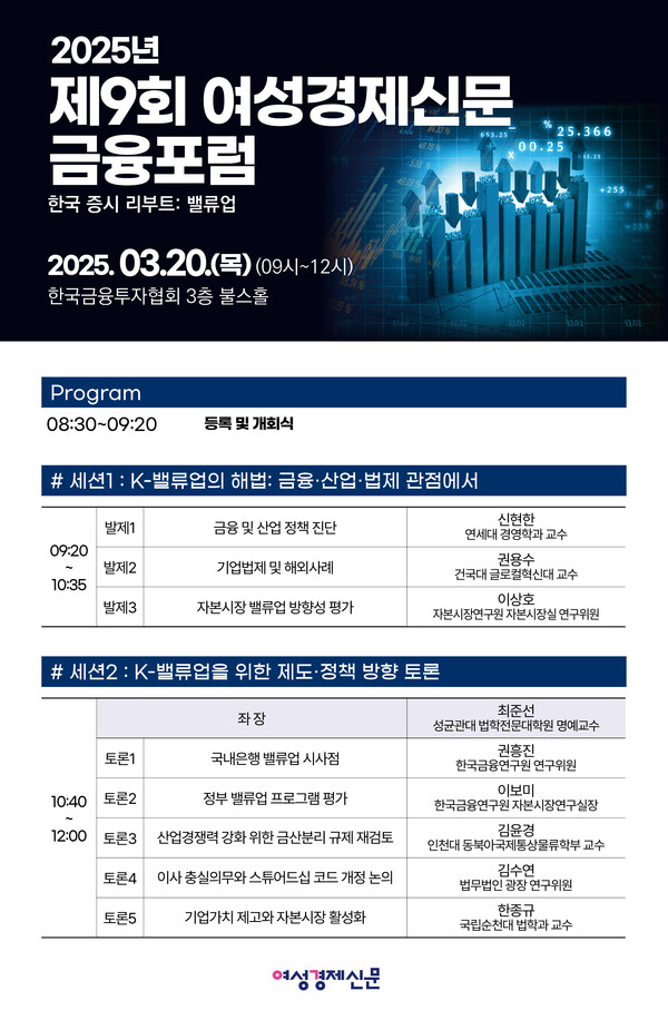 이에 여성경제신문은 2025년 제9회 여성경제신문 금융포럼 '한국 증시 리부트: 밸류업'을 개최하고 한국 증시가 정당한 평가를 받고 지속 가능한 성장을 이루기 위한 정책적·제도적 해법을 모색한다. 포럼은 오는 3월 20일 오전 9시부터 12시까지 서울 여의도 금융투자협회 3층 불스홀에서 열린다.