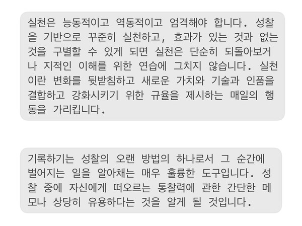 여덟 개의 문을 함께 통과하실 준비가 되셨나요? 여러분이 여덟 개의 문을 안전하게 통과하기를 기원하며 제가 먼저 여덟 개의 문을 통과하며 인상 깊었던 부분을 소개 해드릴게요. 먼저 ‘성찰 그리고 실천’입니다. 각 문에서 저자는 이론에 뒷받침해 성찰과 실천하는 방법을 제시합니다. 이 책은 추상적이나 이론적인 것에 그치지 않죠.