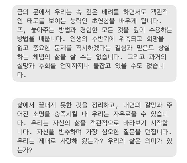 이렇게 성찰과 실천의 방법을 구체적으로 알려주죠. 그리고 여덟 개의 문을 만나며 일과 사랑, 관계에서 성숙해질 수 있도록 안내해줘요. 저는 여덟 개의 문을 읽어가면서 마지막 ‘금의 문’에서 가장 기억에 남는 구절을 만났어요.