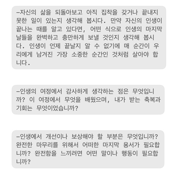 아직은 어렵기만 한 ‘초연’. 과거에 집착하고 미래를 불안해하며 현재에 집중하고 있지 못 하지만요. 꽤 멋진 할머니가 되기 위한 노력을 해보자며 마지막으로 초연해지기 위한 성찰 부분의 질문 중 언제나 되뇌고 싶은 3가지를 소개할게요.