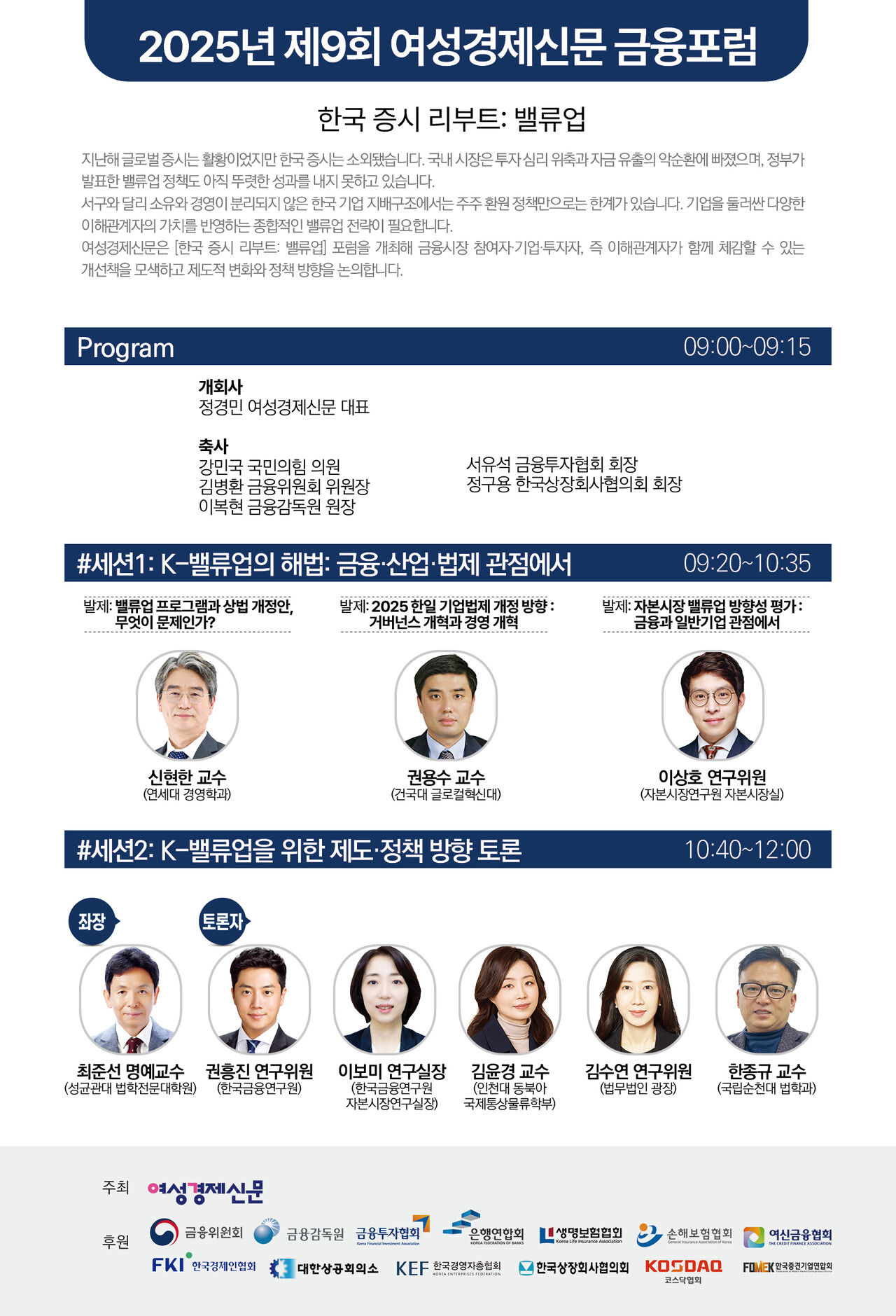 ※ 아래 안내표를 클릭하면 '밸류업 프로그램과 상법개정 논란'을 주제로 오는 3월 20일(목) 오전 8시 30분부터 여의도 금융투자협회 불스홀에서 열리는 제9회 여성경제신문 금융포럼 사전 신청 등록페이지로 연결됩니다.