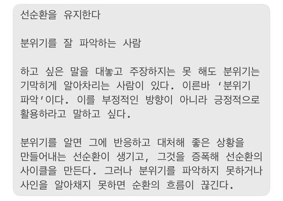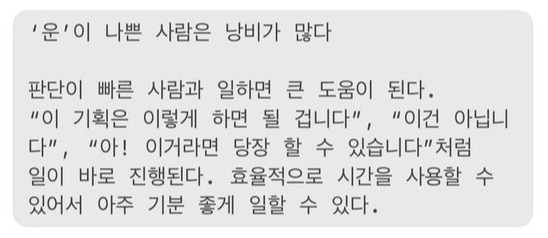 운 자체를 내 마음대로 조절할 수는 없지만 운에 대한 사고방식을 명확하게 하는 일은 지금 당장 할 수 있죠. 사이토 다카시가 말하는 운의 공식이자 기본 원칙을 따르다 보면 운을 내 편으로 만들 수 있어요. 책에서는 15개의 공식으로 설명합니다. 그중 절대 기억하고 싶은 공식 3가지를 소개할게요. 3장 ‘왜 일류는 ‘운이 좋은가’의 공식과 4장 ‘운’을 내편으로 만들 수 있는가의 공식, 마지막으로 5장 어떻게 하면 ‘운’에 휘둘리지 않는가의 공식입니다.