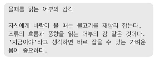 현대는 속도의 사회라 이를 따라가려면 가벼운 심신이 가장 중요해요. 다만 지금은 변동이 격렬한 시대라 계획대로 일이 진행되지 않아서 그날의 조류 상태, 풍향에 따라 판단을 바꿔야 해요. 타이밍을 맞춰 나가야 하죠. 더 나아가 사이토 다카시는 시키는 일만 하는 사람에게는 운이 찾아오지 않는다고 말해요. 어부의 감각이 필요합니다. 야성적인 감을 지니고 시류를 읽으며 신속하게 움직이는 사람이 되어야 하죠.