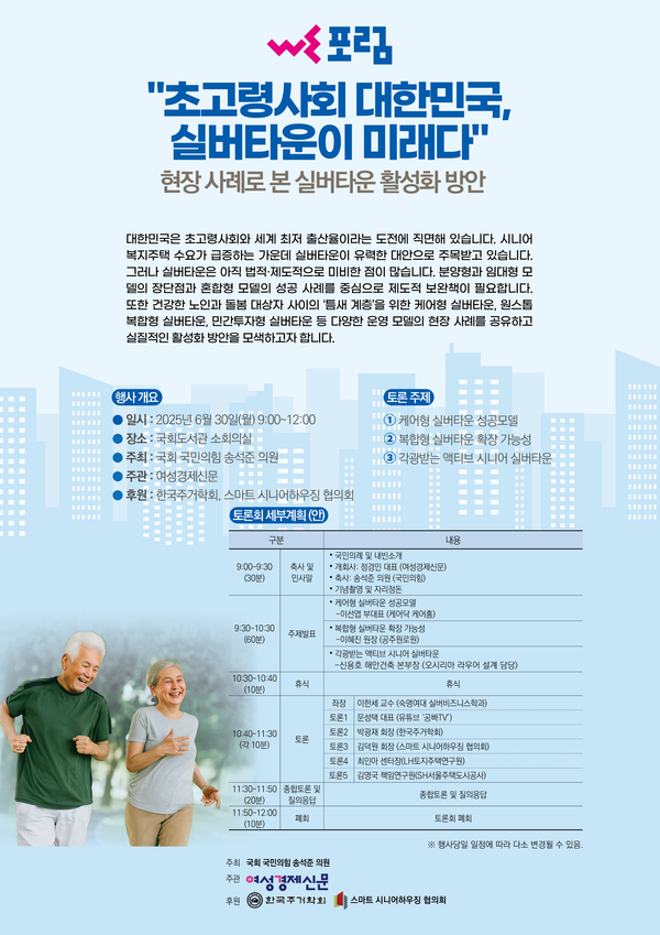 ※ 여성경제신문은 오늘 6월 30일 실버타운 활성화 방안을 모색하는 정책 토론회를 개최합니다. 아래 포스터를 클릭하시면 사전신청 페이지로 연결됩니다. 장소가 협소한 관계로 사전신청하신 분부터 입장 가능합니다.