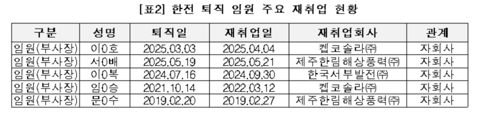 재취업 대상 기관을 보면 켑코솔라(태양광), 제주한림해상풍력(해상풍력), 에너지인프라자산운용(신재생 투자), 카페스(발전정비·태양광 운영), 한전MCS·한전FMS(계량·유지보수) 등 한전이 지분을 보유한 자회사와 출자회사가 대부분을 차지했다. 특히 카페스와 한전FMS 등 일부 출자회사는 2018년 이후 매년 5명 이상 한전 퇴직자가 재취업한 것으로 확인됐다.